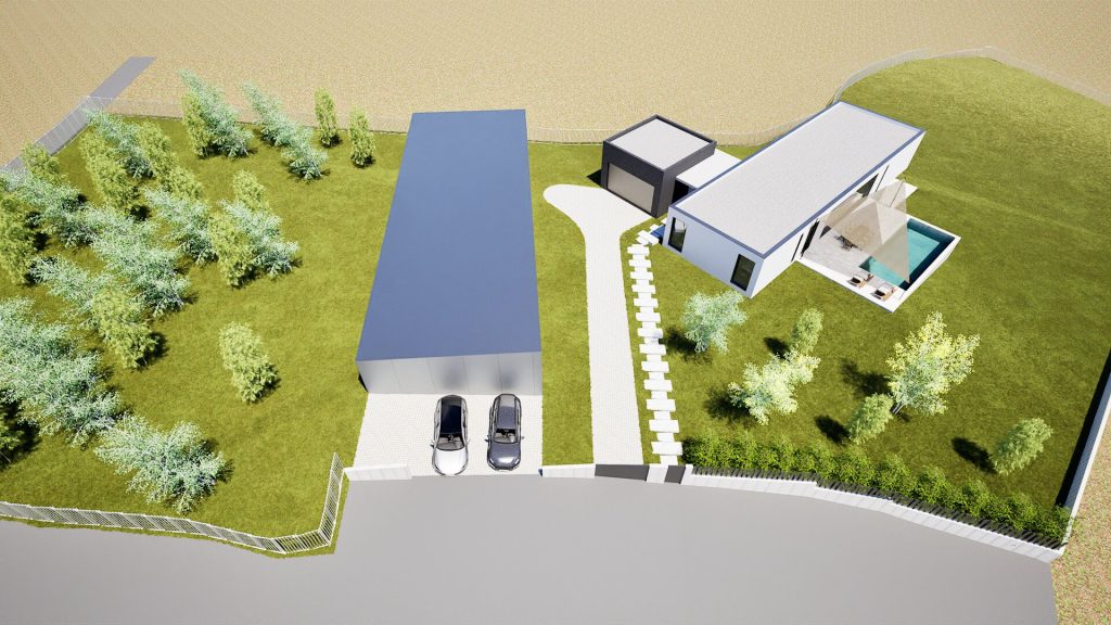 - Volumen principal: alberga la vivienda en una única planta, con un esquema funcional claro y eficiente.