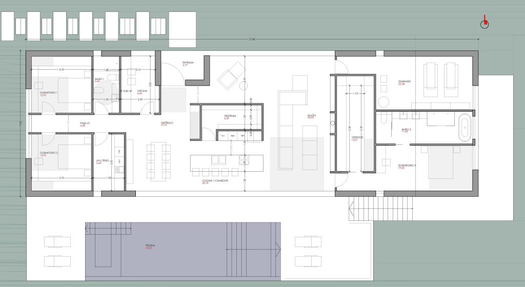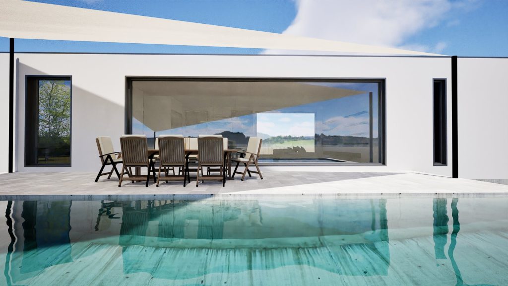 El programa se desarrolla en torno a un gran espacio de día continuo —salón, cocina y comedor— que se abre completamente hacia el exterior mediante un gran frente acristalado. Esta relación directa con la terraza y la piscina convierte el espacio exterior en una prolongación natural de la vivienda.